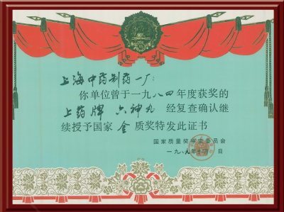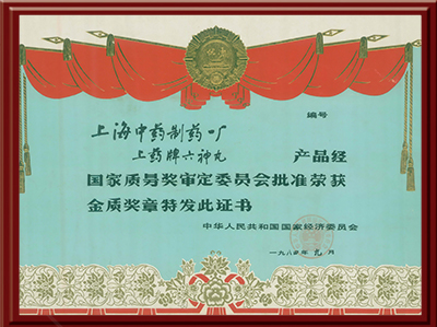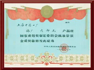 六神丸产品经国家质量奖审定委员会批准荣获金质奖章特发此证书