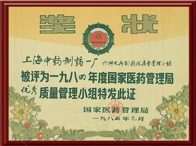 六神丸被评为一九八四年度国家医药管理局优秀质量管理小组特发此证