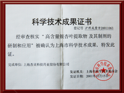 “高含量银杏叶提取物及其制剂的研制和应用”被确认为上海市科学技术成果