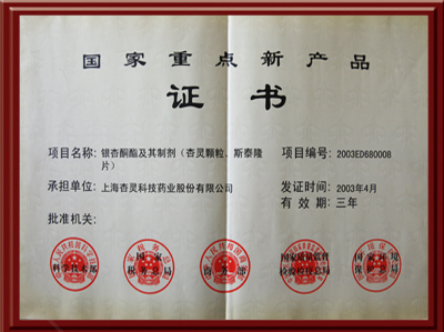 银杏酮酯获得由中华人民共和国卫生部颁发的新药证书