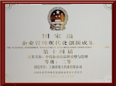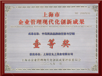 荣获上海市企业管理现代化创新成果一等奖,成果名称:中药民族品牌的重塑和管理