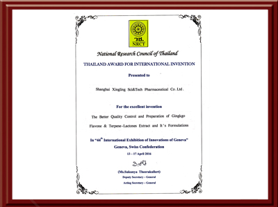 荣获泰国国家研究院颁发奖项证书